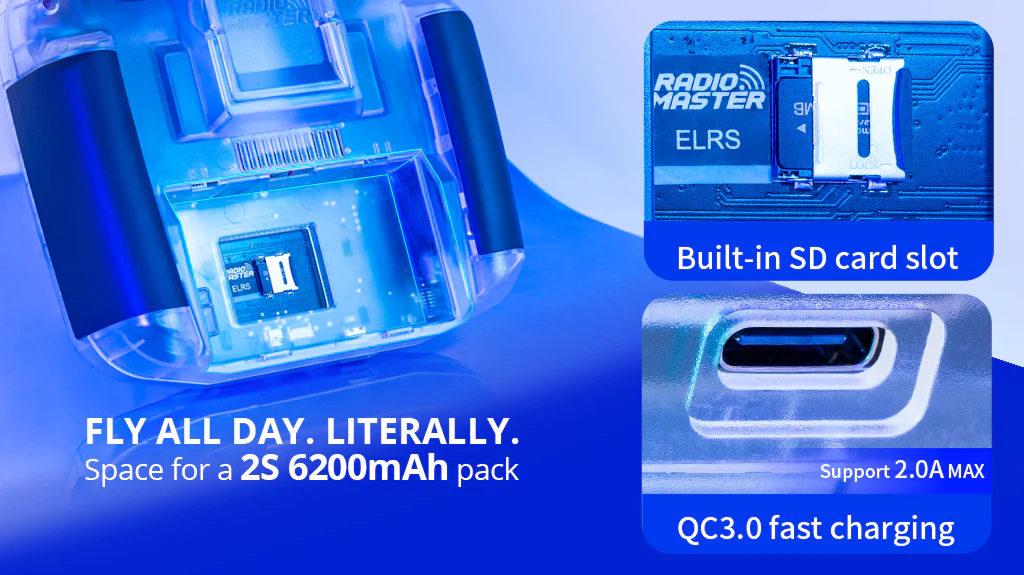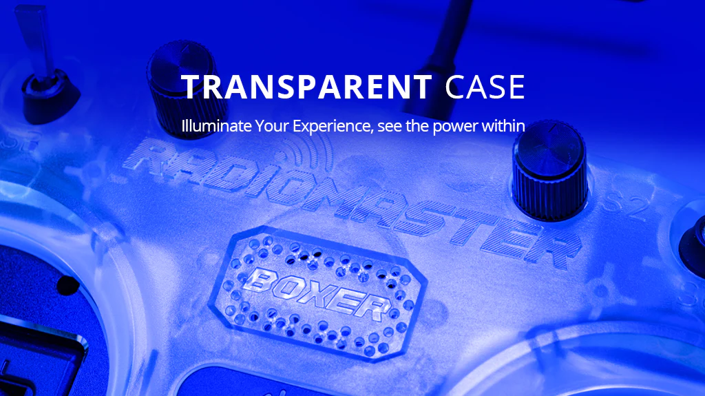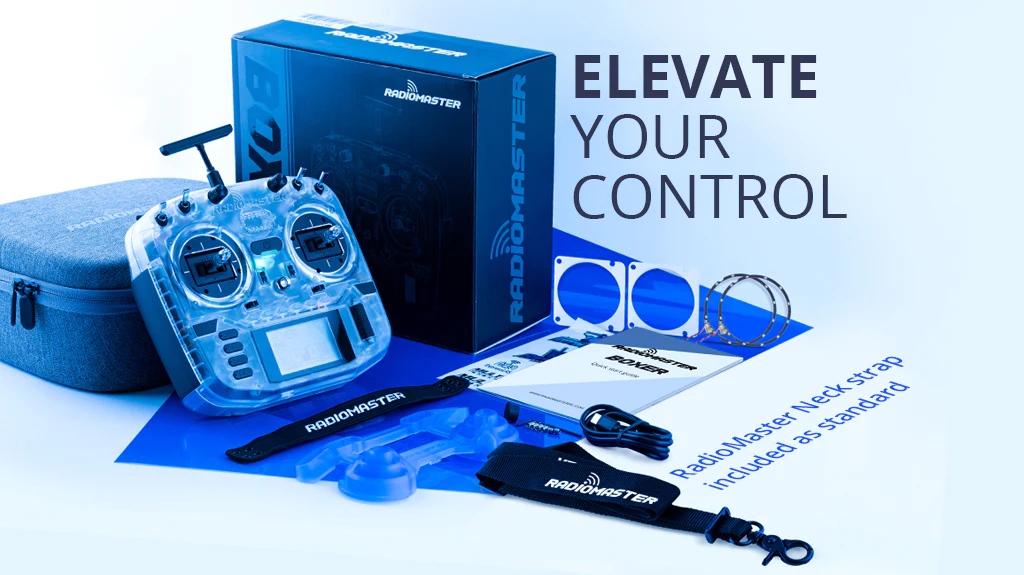 - Special transparent version radio with white Gimbal LED set and RadioMaster Neck Strap included