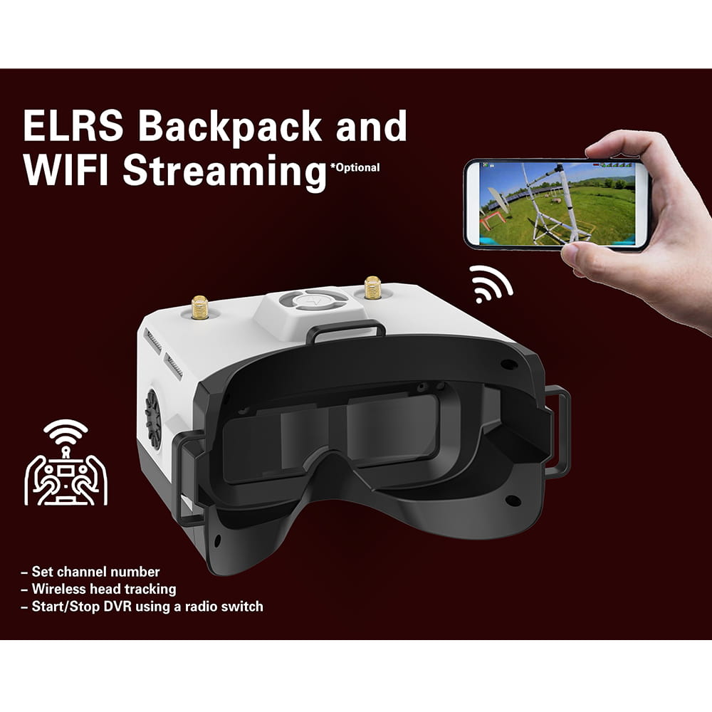 - ESP32 ExpressLRS backpack module for wireless integration with ELRS radios to sync video channel, DVR start/stop, and wireless head tracking (BoxPro+ model required).