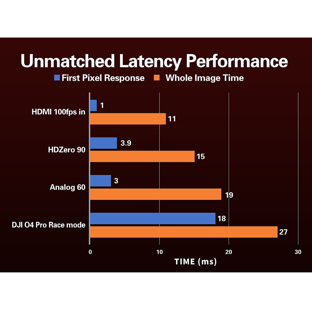 - Near-instantaneous video feedback with 1ms HDMI input latency, 3ms analog camera latency, and 4ms HDZero camera latency.
