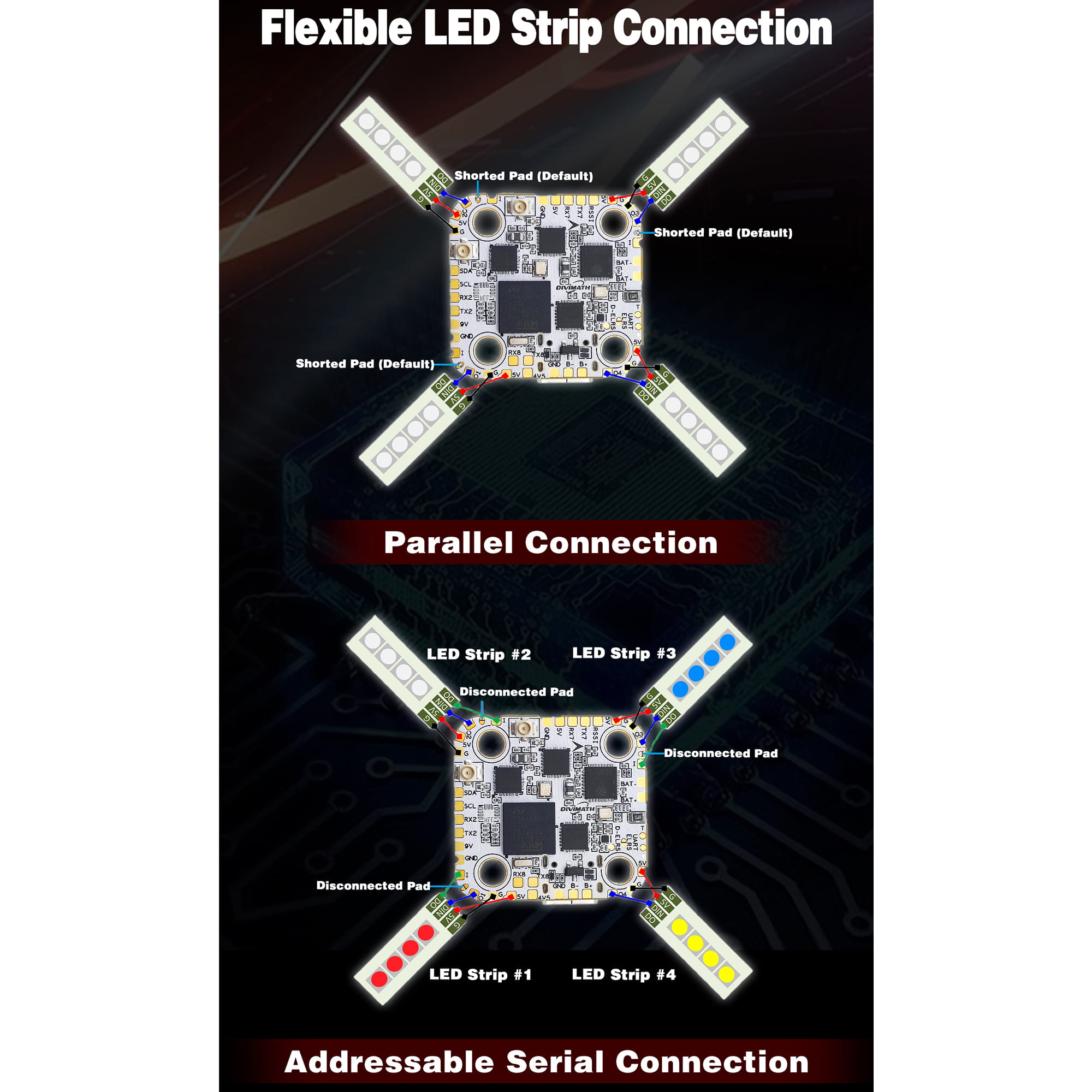 Additionally, the Halo Flight Controller includes a switchable 9V/3A BEC output for video transmitters, alongside a 5V/4A output for LED strips and other peripherals. Its design streamlines LED strip wiring, making it easy to connect parallel LED strips for uniform single-color illumination while simplifying the routing of addressable LEDs.