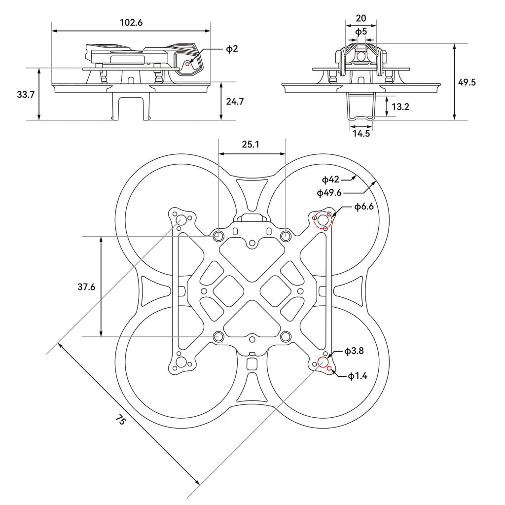 Features an improved connection between the whoop duct and the carbon fiber plate with added supports for a secure fit, ensuring quick and hassle-free assembly. Say goodbye to loose nuts and tedious installations.
