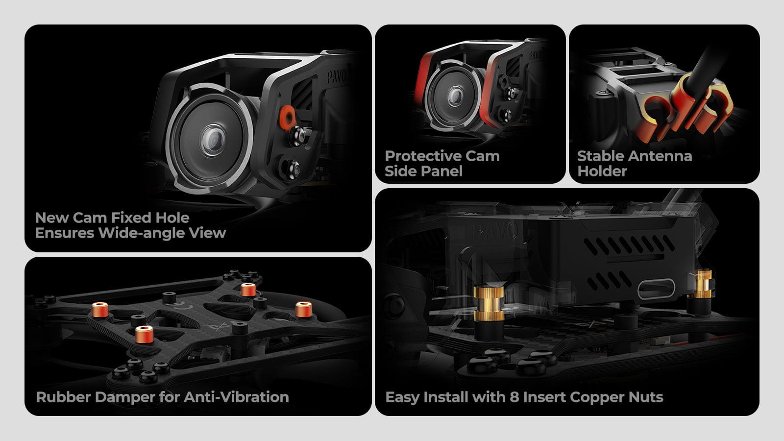 It feature 6 camera fixing holes, including dedicated wide-angle mounting positions to eliminate side-panel shadows and ensure unobstructed field-of-view capture, alongside a reinforced cam side panel that protects lenses while enabling tool-free vertical ND filter swaps. The optimized antenna holder secures cables for stable signal transmission, while the Pavo Series’ signature rubber damper design eradicates vibrations for jello-free footage.