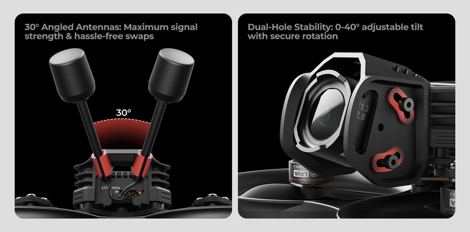 - New O4 Air Unit Pro Bracket: It retains all O3 Bracket features while adding dual fixing holes for optimized camera rotation (0-40° tilt) and 30° angled antenna mounts for stronger signal in a reinforced design.